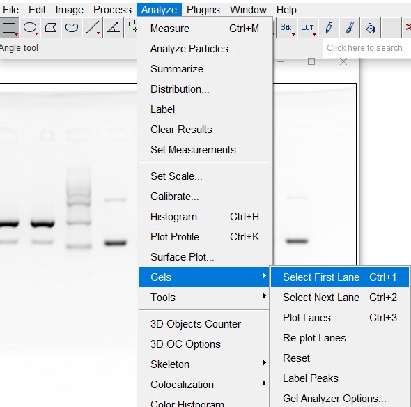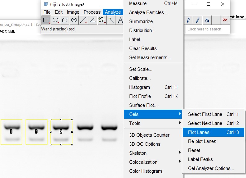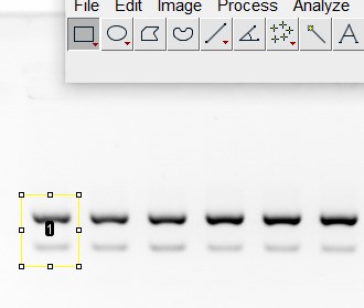 - 用矩形框选目的条带,然后analyze->gels->select first lane,或者使用快捷键Ctrl+1
