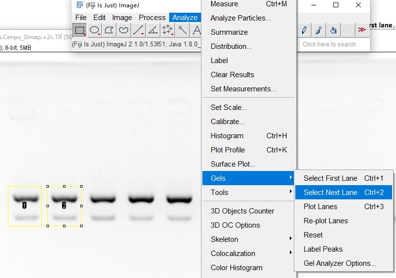 - 然后拖动矩形框(不能重新绘制,因为要保证所有矩形框大小相同),到下一个条带的位置,analyze->gels->select next lane,或者使用快捷键Ctrl+2